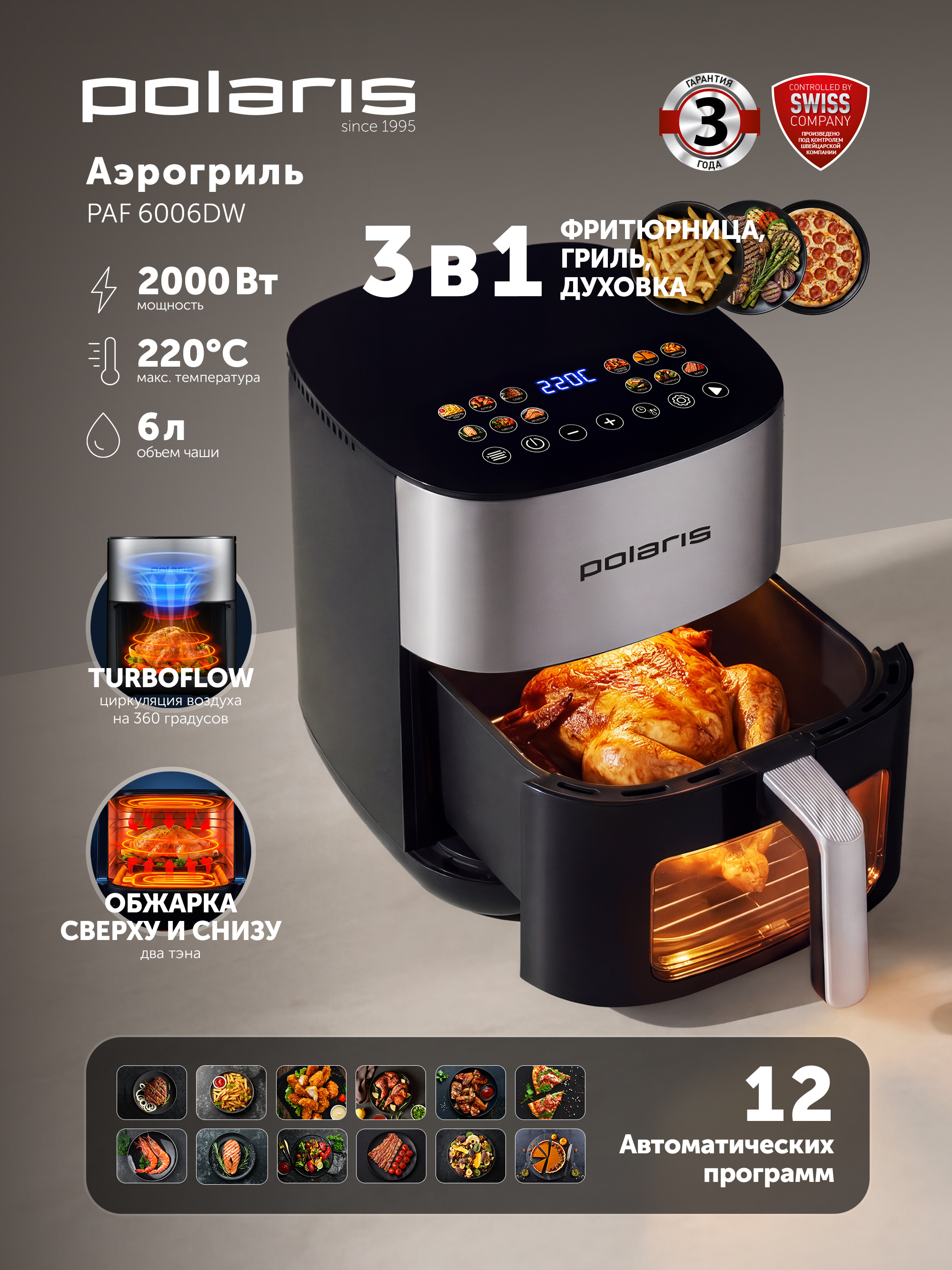 - СвойстваREMOVABLE GRILLEЁсцьTWO TENSЁсцьВечкаЁсцьДысплейЁсцьУпраўленне са смартфонаЁсцьЧару можна мыць у посудамыйнай машынеЁсцьХарактеристкиАб'ём чары, л6Колькасць аўтапраграм12Макс. тэмпература нагрэву, °С220Максімальны час усталёўкі таймера480Матэрыял корпусаМетал, ПластыкМін. тэмпература нагрэву, °С35Праграмы падрыхтоўкіпирог, пицца, выпечка, запекание, грильСістэмы абароныТып кіраваннясенсорноеТып награвальнага элементатэнУнутранае пакрыццё чарыГабарытыВага нета, кг5Даўжыня шнура, гл120