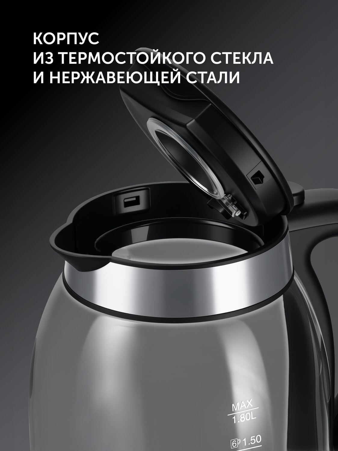Стильный стеклянный корпус из высококачественного термостойкого стекла создает элегантный внешний вид и позволяет наблюдать за процессом закипания воды. Стекло проходит инструментальную проверку однородности и чистоты. Объем 1,8 литра. Мерная шкала на корпусе электрочайника. Яркая внутренняя подсветка добавляет атмосферности процессу заваривания чая или кофе.