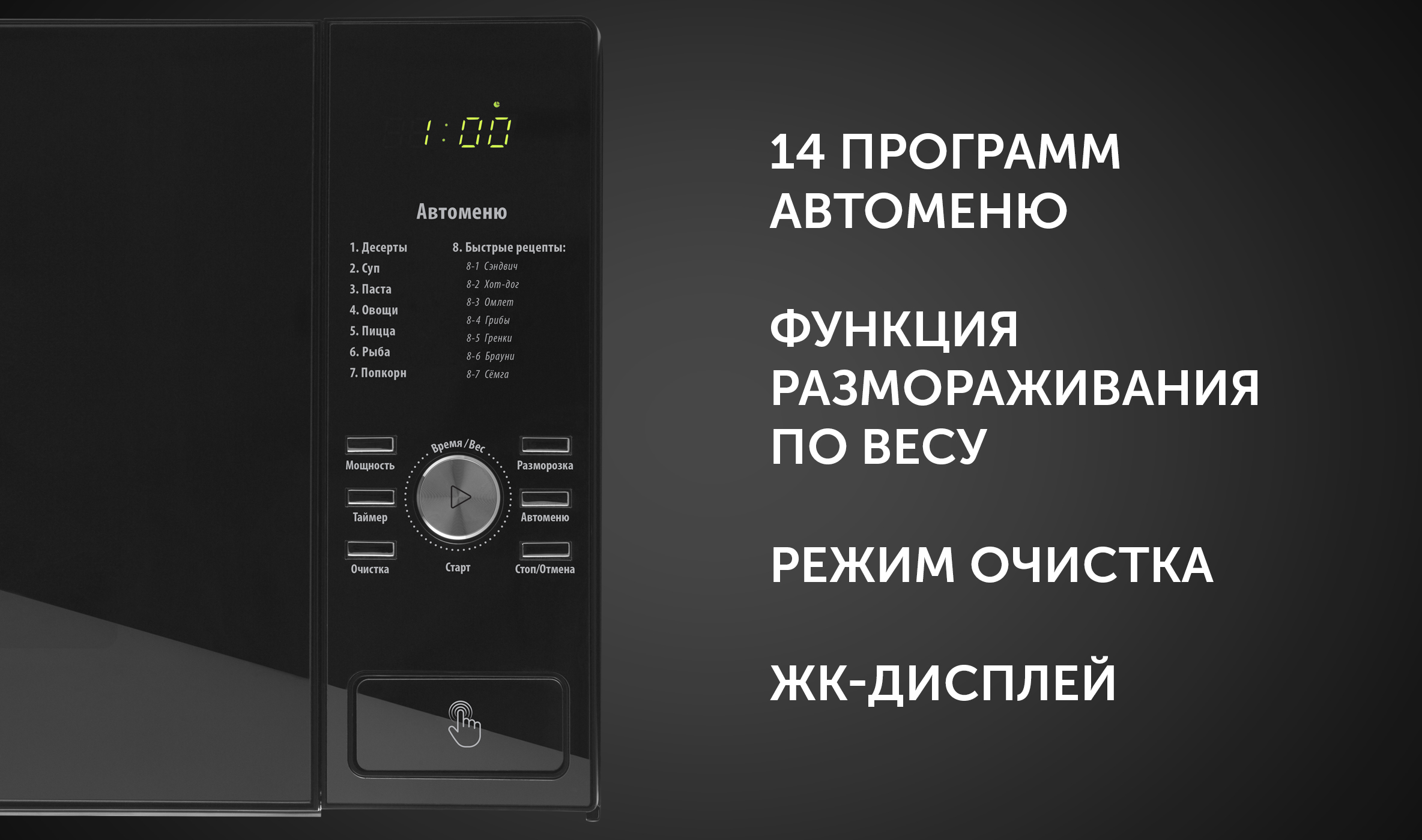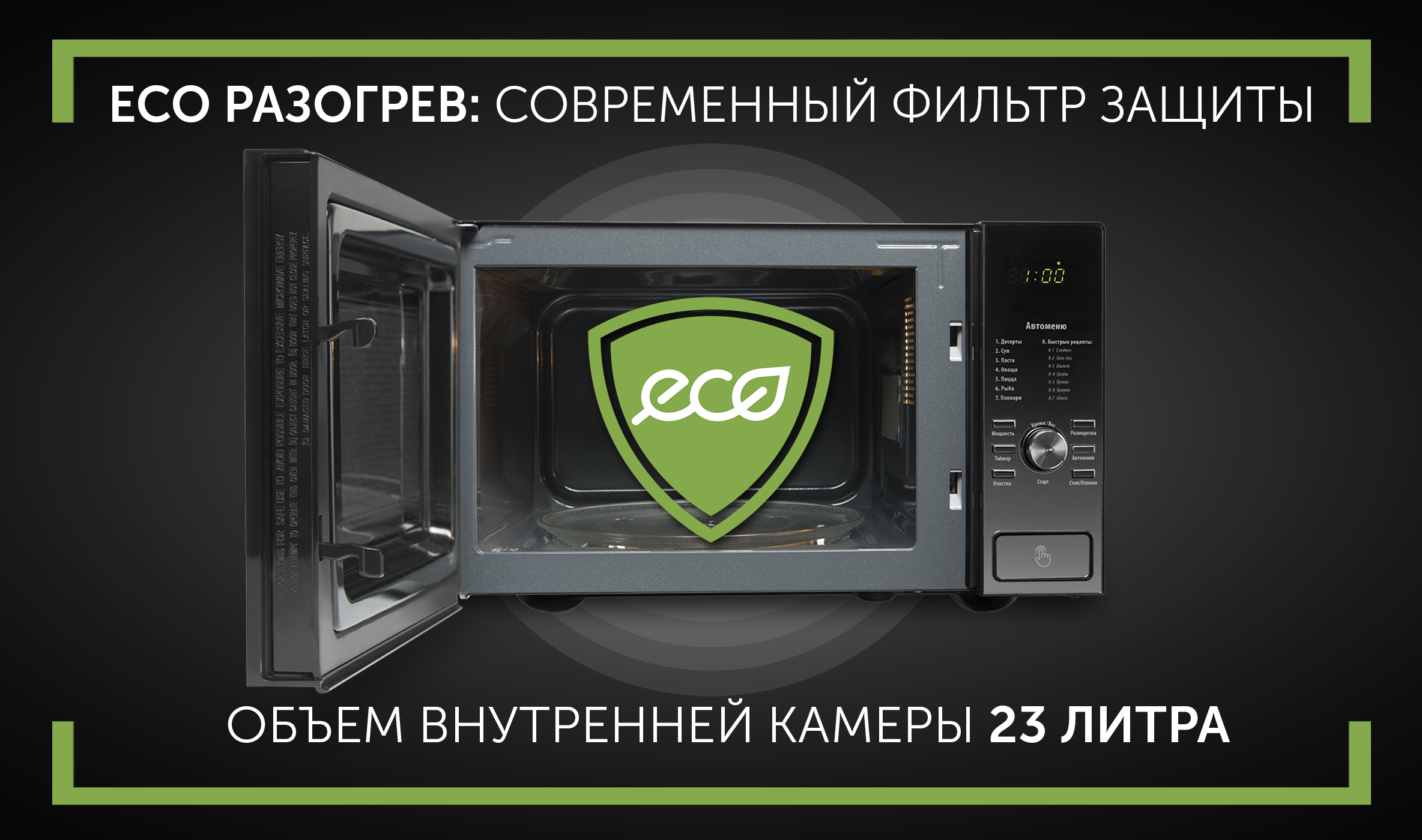 - Технические характеристикиНамінальная рабочая магутнасць1400 ВтАб'ём ўнутранай камеры23 л3D TurboHeat: сістэма раўнамернага размеркавання мікрахваляў і прыгатавання з 3-х бакоўЁсцьECO разагрэў: Сучасны фільтр абароныЁсцьPRO - 3 EASY CARE: інавацыйнае пакрыццё лёгкай ачысткіЁсцьФункцыя размарожвання па вазеЁсцьКолькасць праграм автоменю14Блакаванне ад дзяцейЁсцьВК-дысплейЁсцьПадсвятленне падчас працыЁсць10 гадоў гарантыі на пакрыццё ад карозііЁсцьЯкое верціцца шкляное страва, d270ГабаритыВага нета, кг13Вага брута, кг15Габарыты кораба, см54,7x41x33,7Колер105