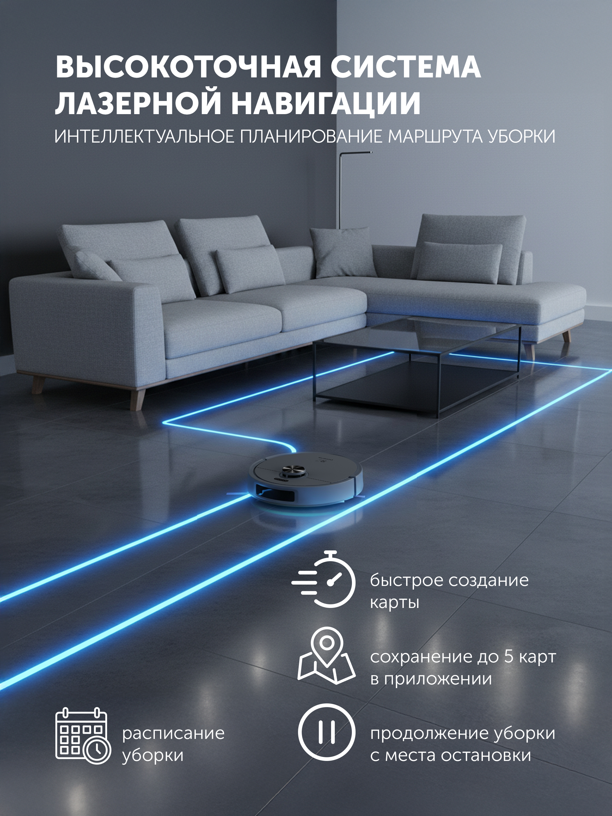 • Высокоточная система лазерной навигации для построения карты помещения, сохраняет до 5 карт
