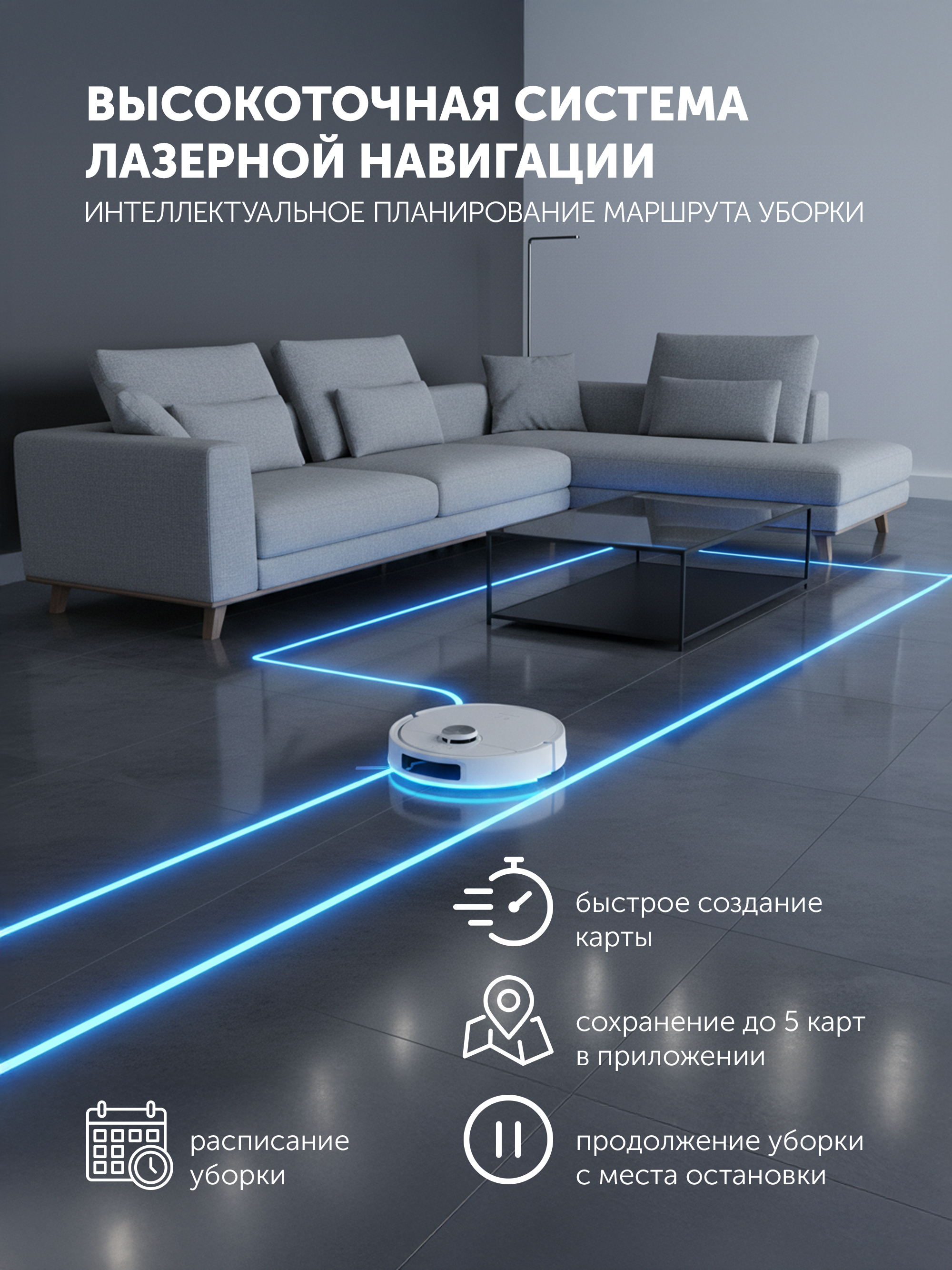 • Высокоточная система лазерной навигации для построения карты помещения, сохраняет до 5 карт