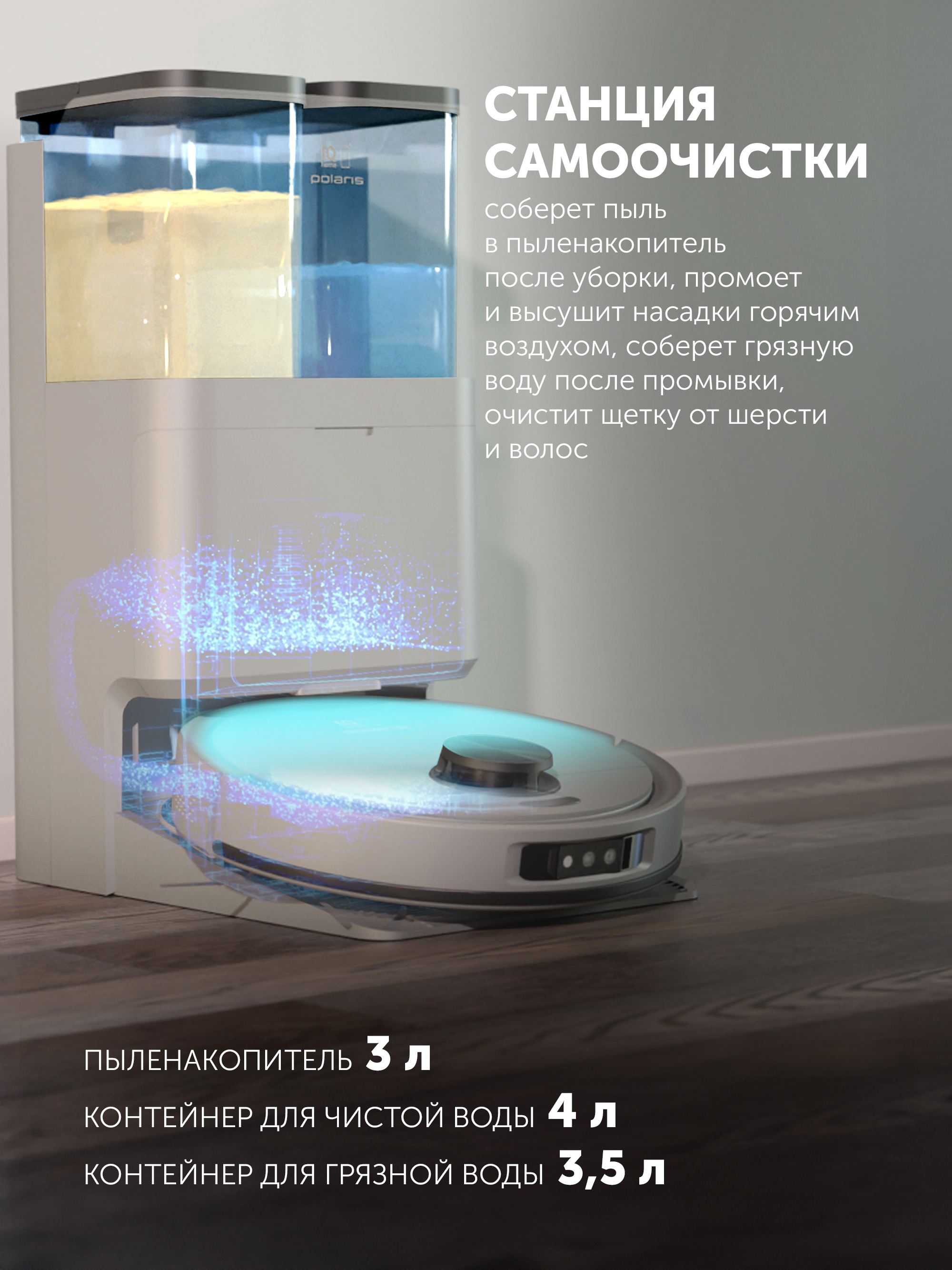 Полноценная станция самоочистки надолго избавит от хлопот по уборке, ведь робот сам сделает все, что нужно: соберет сухой мусор, вымоет пол с помощью вращающихся насадок из микрофибры, промоет и высушит насадки. Вам останется только слить воду из контейнеров. Дополнительные возможности при уборке на коврах: увеличение мощности всасывания при сухой уборке и поднятие насадок с микрофиброй на ковре при влажной уборке. Расширенные функции станции: подогрев воды для промывки насадок с микрофиброй, сушка насадок горячим воздухом, функция очистки основной щетки от волос. Тщательная уборка вдоль стен и углов при помощи выдвижного держателя насадки для влажной уборки.