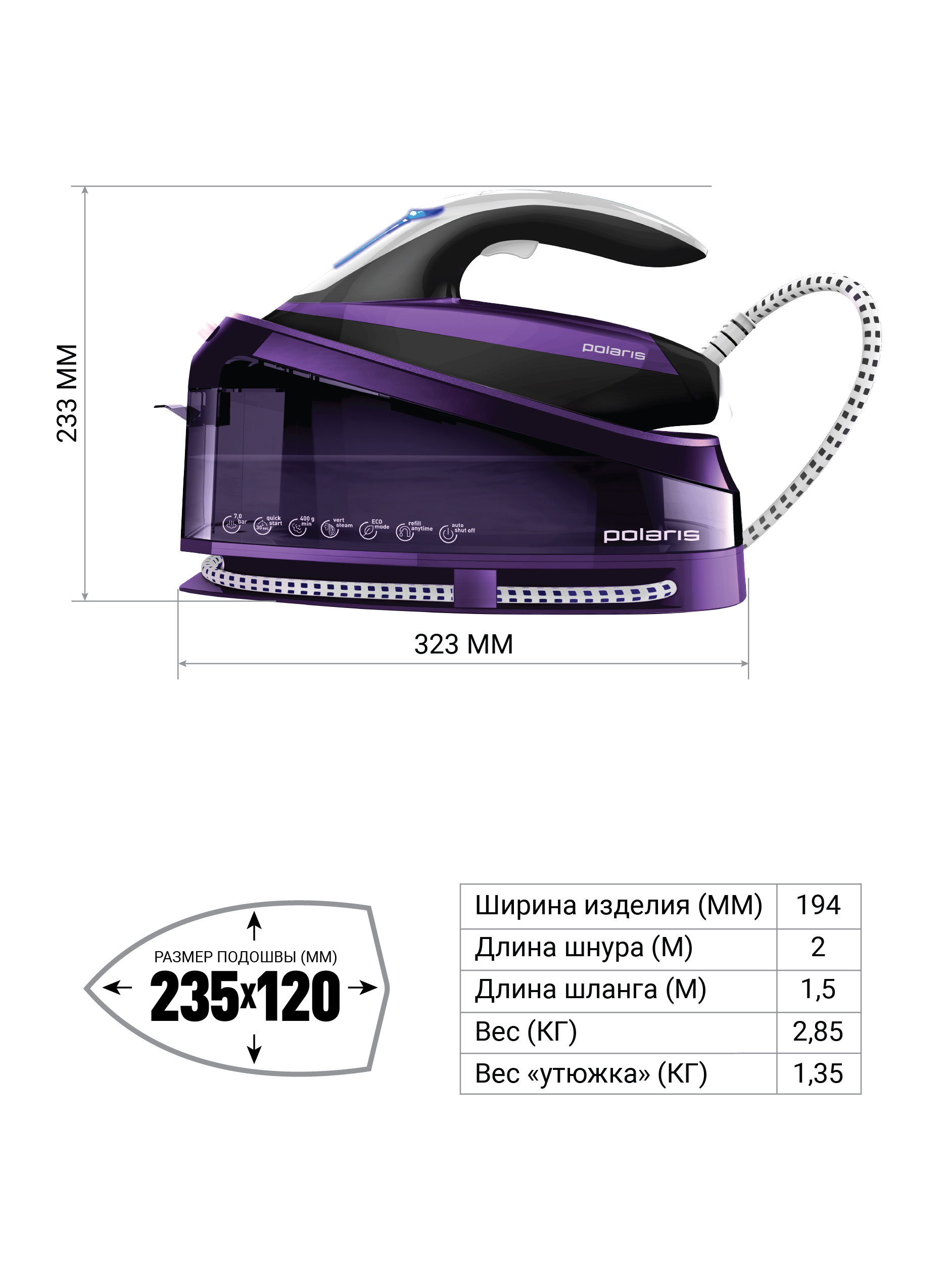 - SpecificationsPuissance, W3000 WType de semelleCouleurФиолетовый-черный120FunctionPuissance du « tir à la vapeur »400 g/minDébit de vapeur120 g/minOuiSecurity systemArrêt automatiqueOuiDimensionsPoids net2 kgPoids brut, kg3Dimensions de la boîte, cm35x22x25Couleur20023,5x12