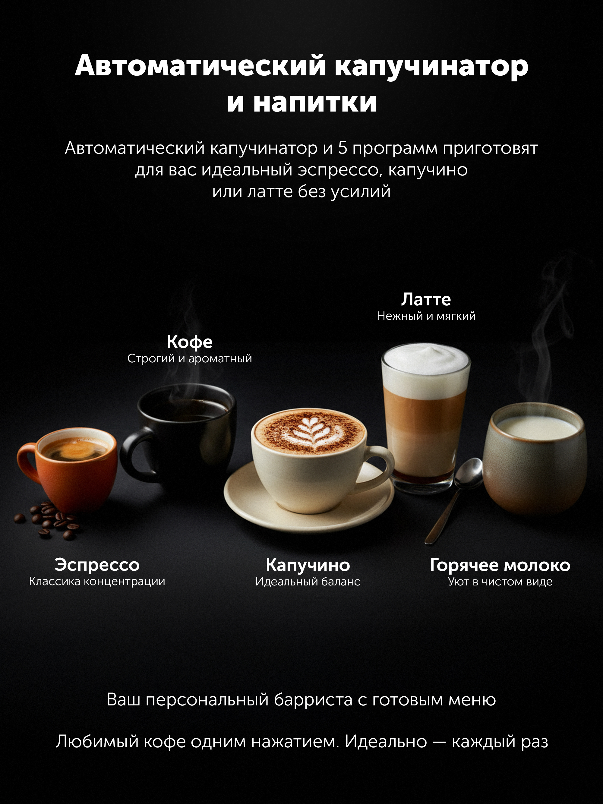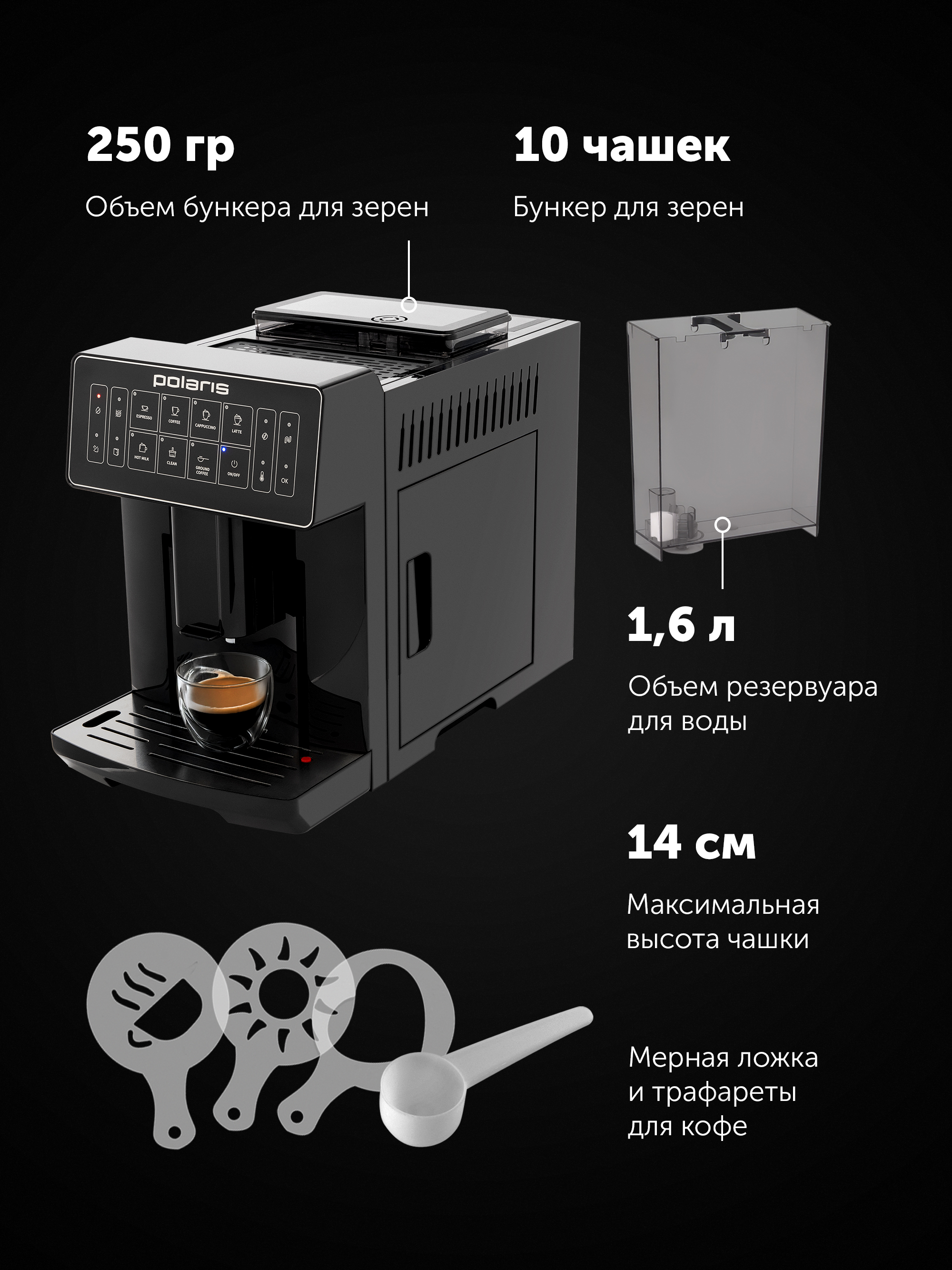 - ГабаритыНетто салмағы, кг9Жалпы салмағы, кг11Қорап өлшемдері, см52x31x41,5Сымның ұзындығы, см110Технические характеристикиҚуаты, Вт1450Су контейнерінің көлемі1,6Емкость бункера для зерен250 грМаксимальная высота чашки14 смЕмкость контейнера для отходов10ТүсічерныйСвойстваСуға арналған алынбалы резервуарБарАлынбалы паллетБарСенсорлық дисплейБарТот баспайтын болаттан жасалған платформаБарСүт көбігіндегі суреттерге арналған трафареттерБар