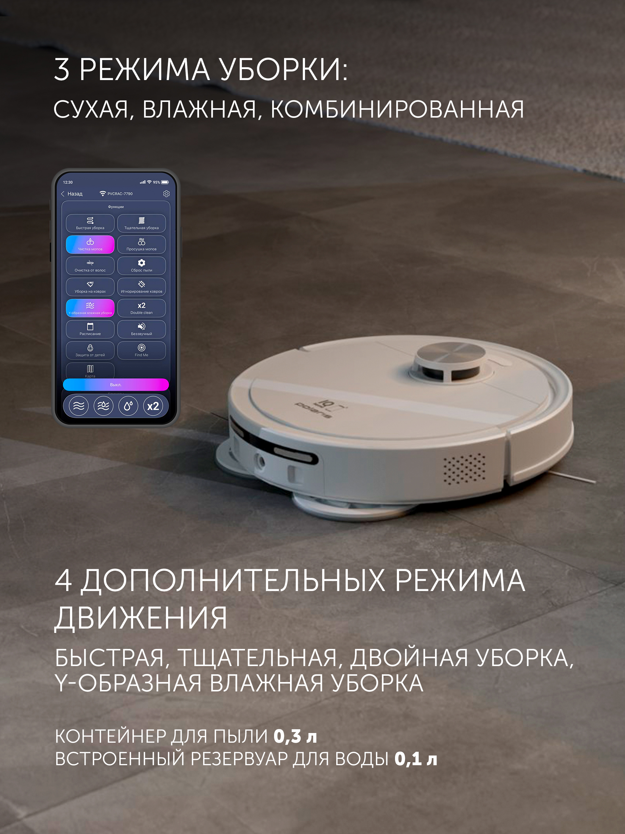 - ГабаритыНетто салмағы, кг12Жалпы салмағы, кг16Қорап өлшемдері, см48,5x39x64ХарактеристикиТазалау түрісухая, влажная, комбинированная90Бүйірлік щеткалар1Қуаты, Вт90ТүсібелыйСвойстваБарБөлмеде бағдарлануға арналған ультрадыбыстық белгіштерБарБөлмеде бағдарлануға арналған инфрақызыл белгіштерБарНЕРА сүзгісіБарЖиһаздың астын жинауға ыңғайлылық үшін жазық корпусБарБазаға автоматты қайтуБарТолығымен автоматты жинауБарАмортизациялайтын доңғалақтарБарВиртуалды қабырғаБарДыбыстық сүйемелдеуБарЛазерная и гироскопическая навигацияБарЫлғалды тазалауБарSignal when stuckБарОграничение зоны уборкиБарОтправка в точку на картеБарРасписание уборкиБарСохранение картыБарТиімді жинауға арналған бүйірлік щеткаларБарФункция "найди меня"БарҮй-жай картасын құруБар