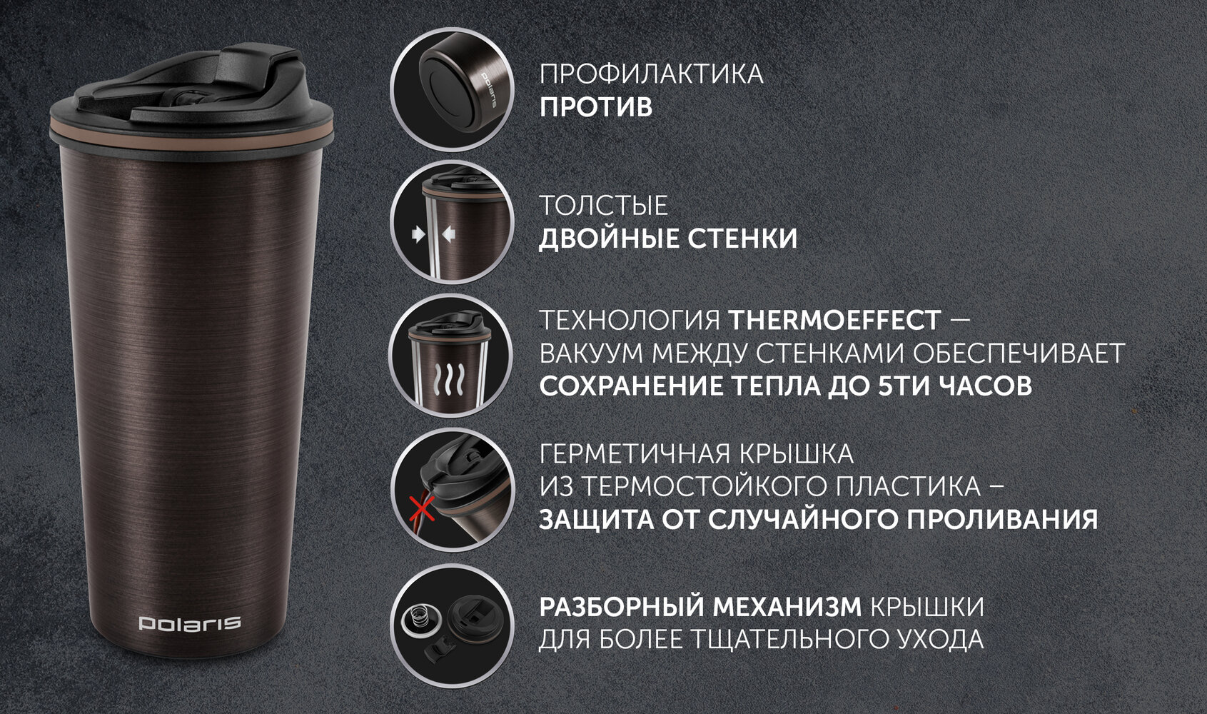 При правильном использовании термокружки (правильном закрывании крышкой, выпустив лишнее давление с кружки) она не течёт, плотная, герметичная крышка, долго держит тепло. И самое главное это не ТЕРМОС, а термокружка. Свои функции вполне достойно выполняет. Для людей которые знают чего хотят и понимают что покупают - рекомендую.