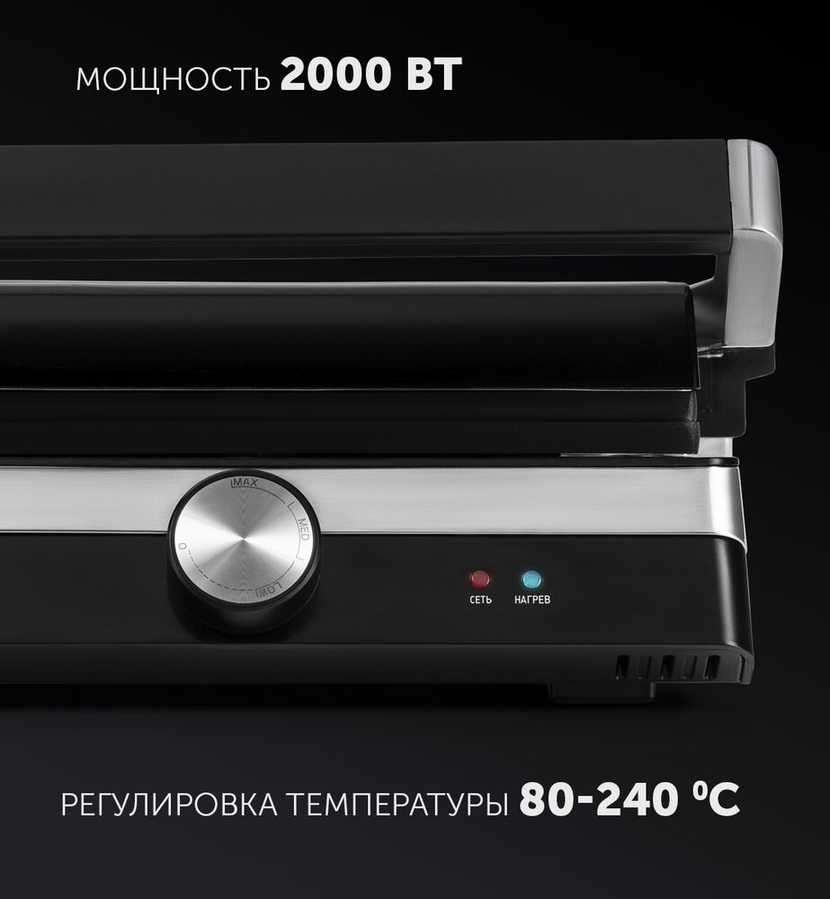 Электрогриль отличается высокой мощностью (2000 Вт). Предусмотрены три температурных режима. С остальными техническими характеристиками прибора можно ознакомиться на официальном сайте производителя Polaris.