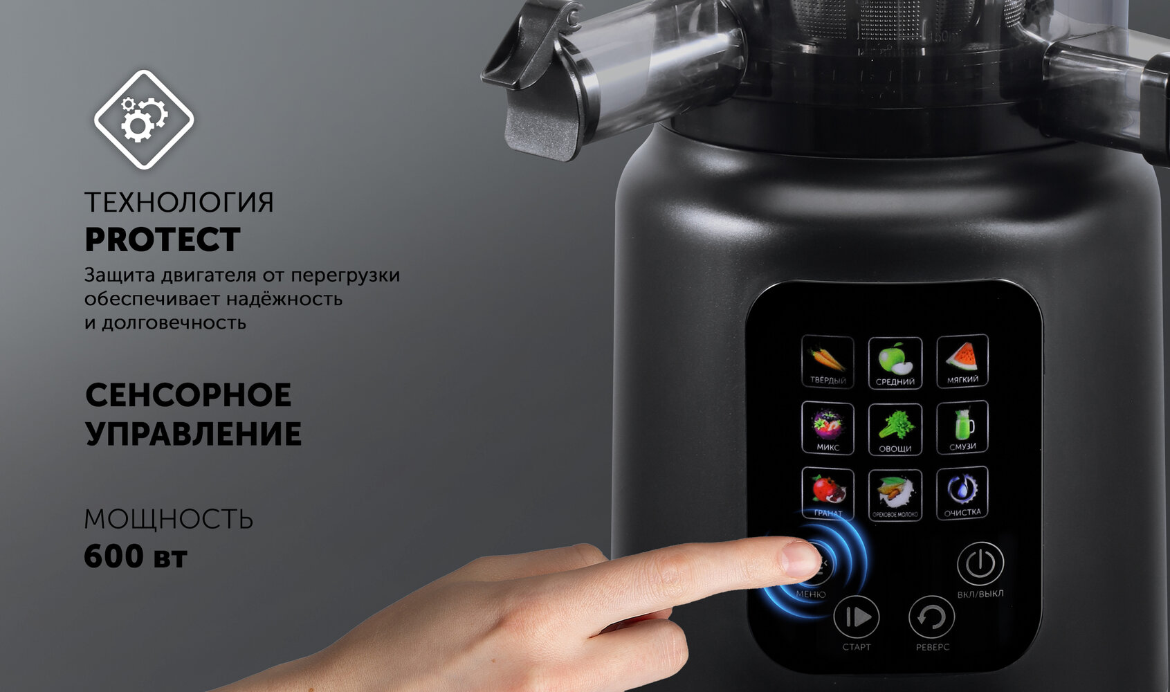 - Технические характеристикиПотужність, Вт600Матеріал корпусаПластикДіаметр горловини78Ємність для збирання м'якоті, л1Автоматичний викид м'якотіЄКолірчерныйМікрофільтр з нержавіючої сталіЄНековзкі ніжки / присоски до столЄФункцииФункція "капля-стоп"ЄФункція «Реверс»ЄСистема защитыАвтоматичне блокуванняЄАвтоматичних захист двигуна від перевантаженняЄГабаритыВага нетто, кг4Габарити короба, см23,5x25x56,5